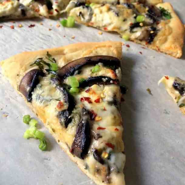 Champiñones, jamón cocido, panceta, chile y ajo, en salsa pomodoro.
