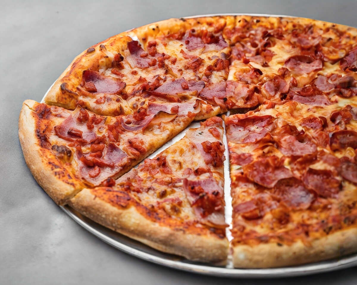 8 rebanadas de pizza grande con jamón y salchicha.