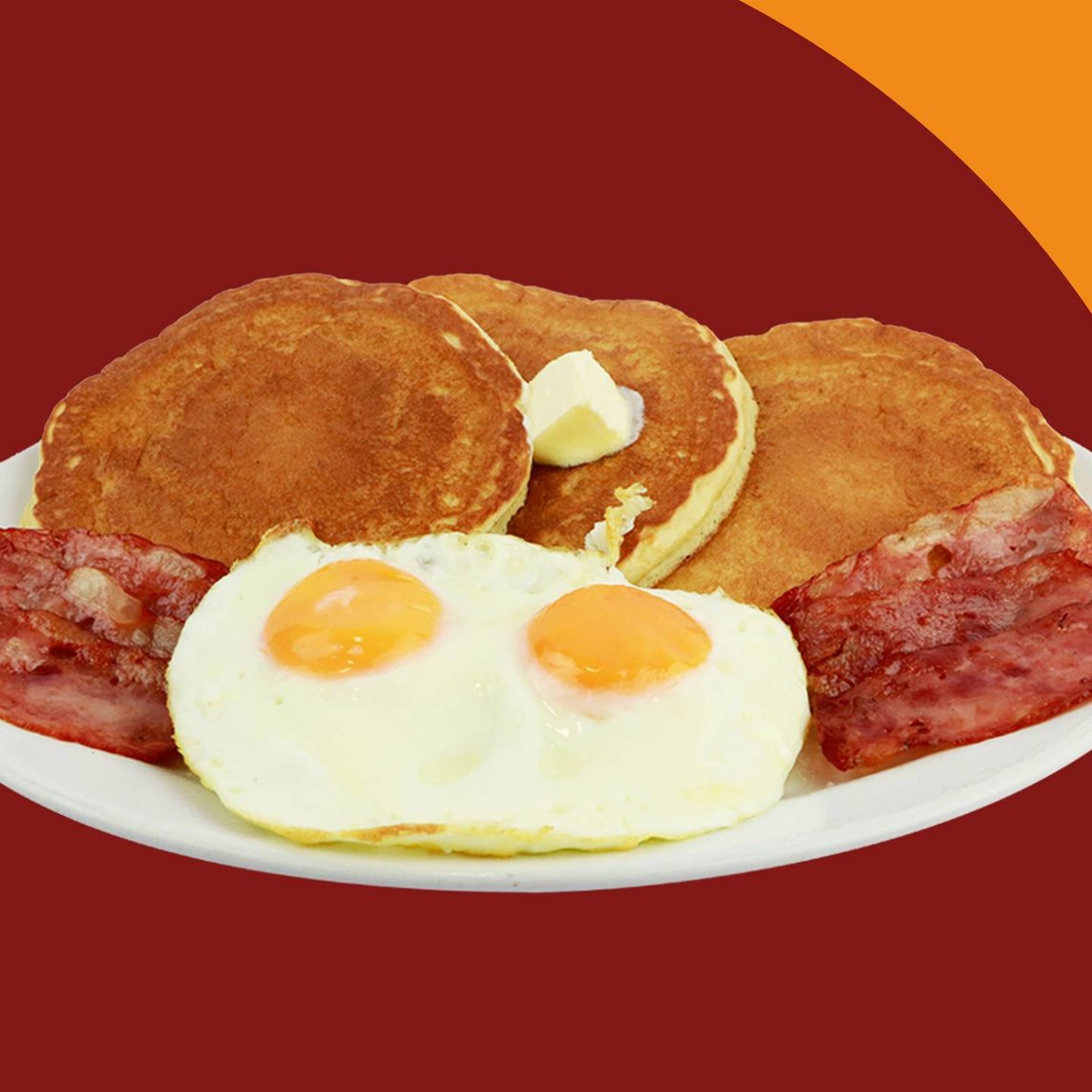 Tres hot cakes recien hechos, acompañados con dos huevos estrellados y tocino en tiras, mantequilla y miel maple.
