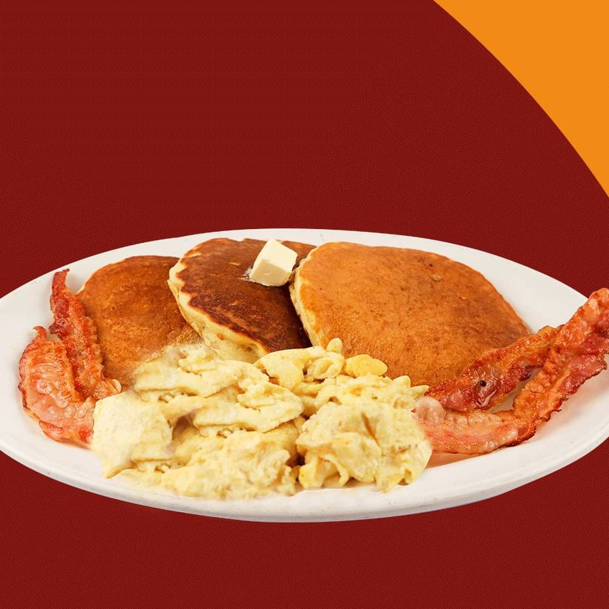 Tres hot cakes recien hechos, acompañados con dos huevos revueltos y tocino en tiras, mantequilla y miel maple.