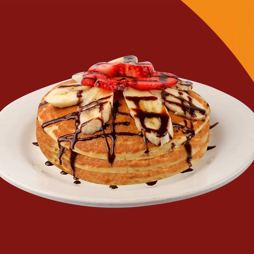 Dos hot cakes esponjosos preparados con nuestra deliciosa pasta de la casa, acompañado con plátano y fresa bañados en chocolate o mermelada, o miel maple.