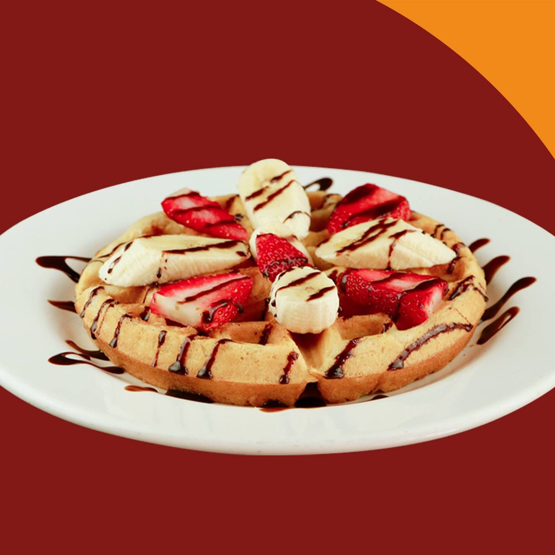 Un waffle preparado con nuestra deliciosa pasta de la casa, acompañado con plátano y fresa bañado con chocolate o mermelada, o miel maple.