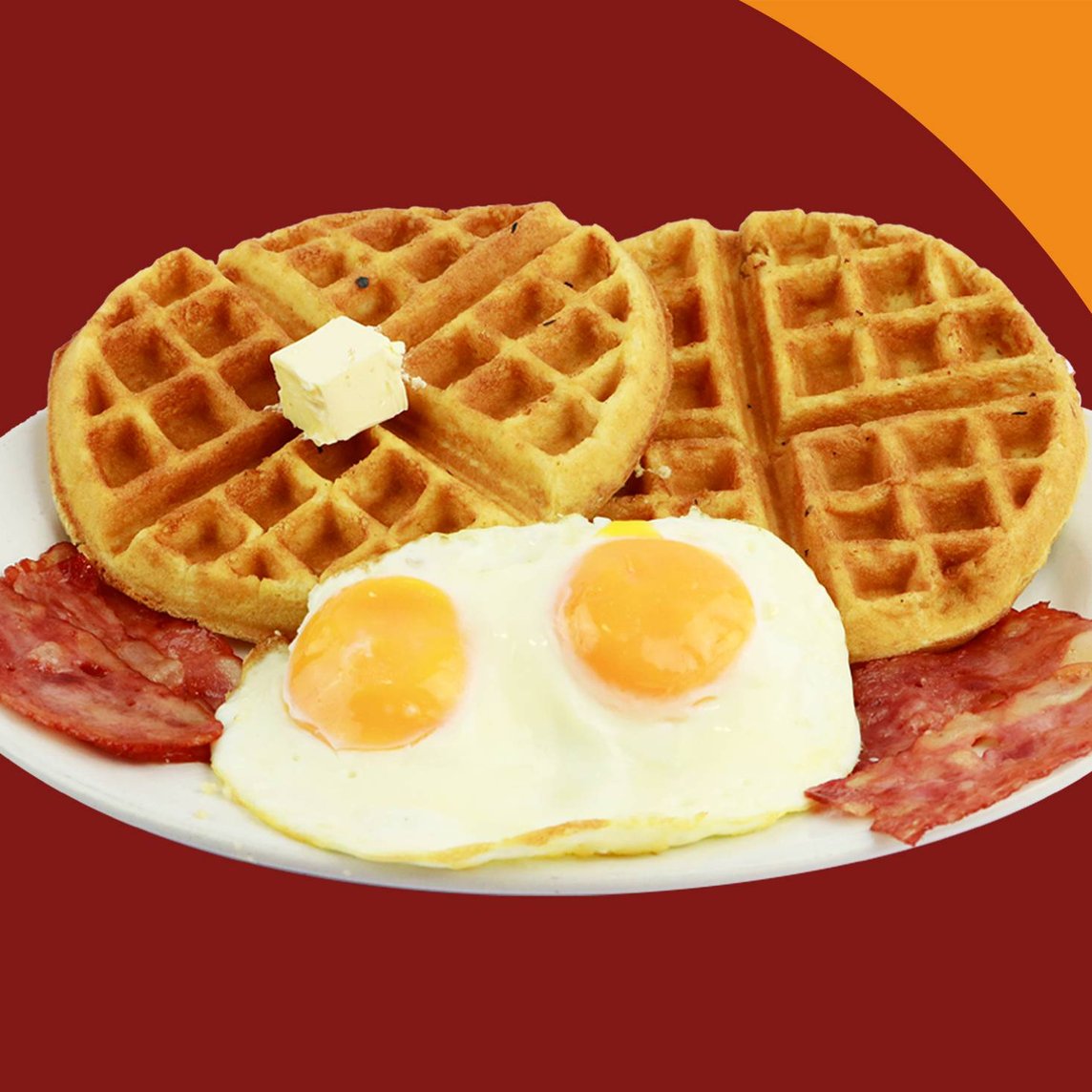 Dos waffles recien hechos, acompañados con dos huevos estrellados y tocino en tiras, mantequilla y miel maple.