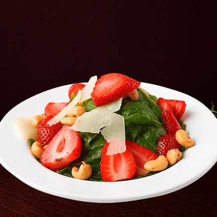 Espinacas frescas, fresas, nuez de la India y parmesano, con un toque de vinagre balsámico y aceite de oliva extra virgen.