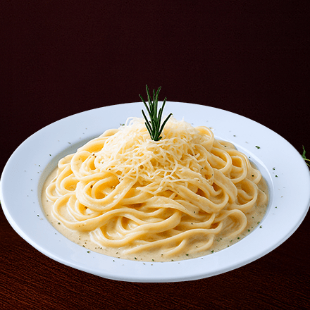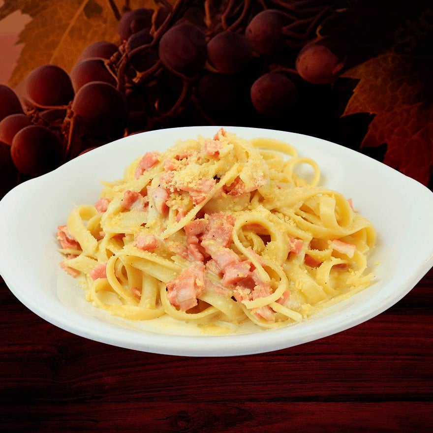 Espaguetti o Fetuccine a la mantequilla con jamón y tocino con crema, con queso parmesano.