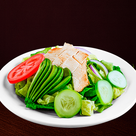 Con fajitas de pollo asado, mix de lechuga italiana, orejona y romana, aguacate, apio, pepino, jitomate, zanahoria, cebolla morada y crutones.