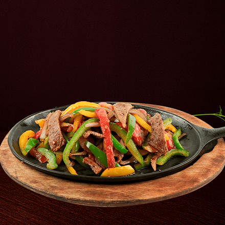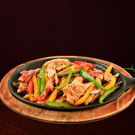 Tiras de pechuga de pollo sazonadas y salteadas con pimientos morrones y cebolla. Servidas sobre plancha caliente.