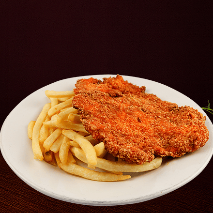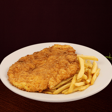 250 gr de milanesa de pollo empanizada acompañada de papas a la francesa.