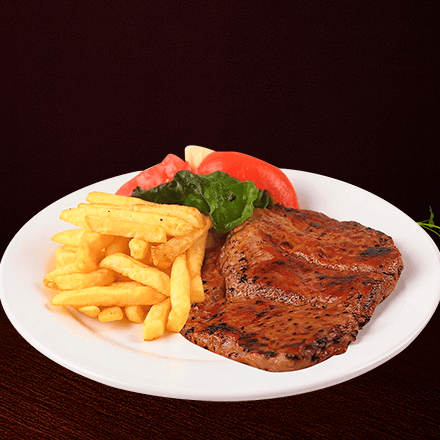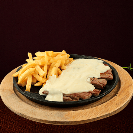 250 gr de corte de arrachera jugosa y tierna, a la plancha con guarnición de papas fritas, y queso fundido.