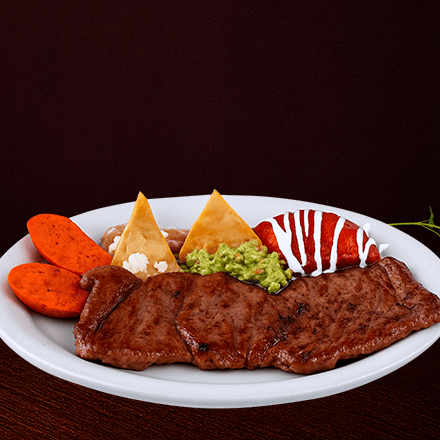 220 gr de exquisito filete, acompañado chorizo asado, frijoles refritos, guacamole y una enchilada roja.