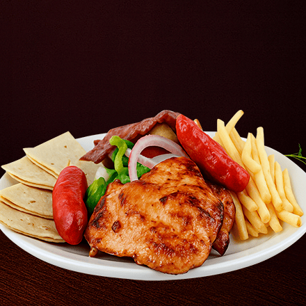 130 gr de pollo a la plancha, 130 gr arrachera, 2 pz de chorizo asado y 2 quesadillas, acompañado con ensalada clásica y papas a la francesa.