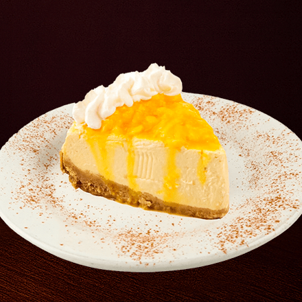 Rebanada de Cheesecake cremoso con base de galleta y suave glase de durazno.