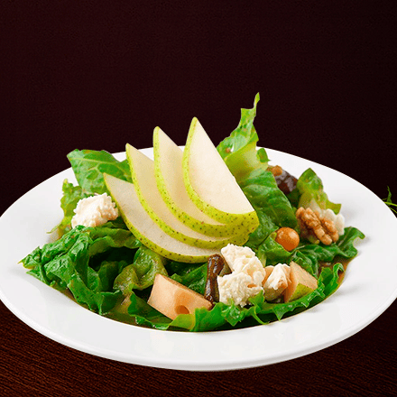 Combinación de lechuga italiana, pera, queso de cabra y nuez de castilla, con un aderezo de oporto, miel y aceite de oliva.