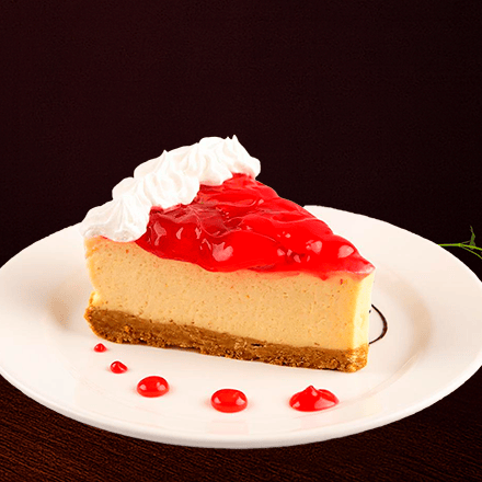 Rebanada de Pay de queso cremoso con base de galleta y glase de fresa.