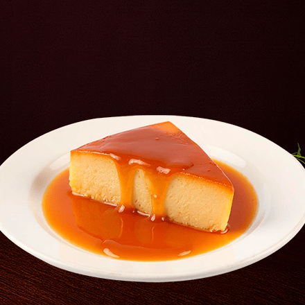 Rebanada de Flan napolitano cremoso con suave sabor a vainilla y toque de caramelo.