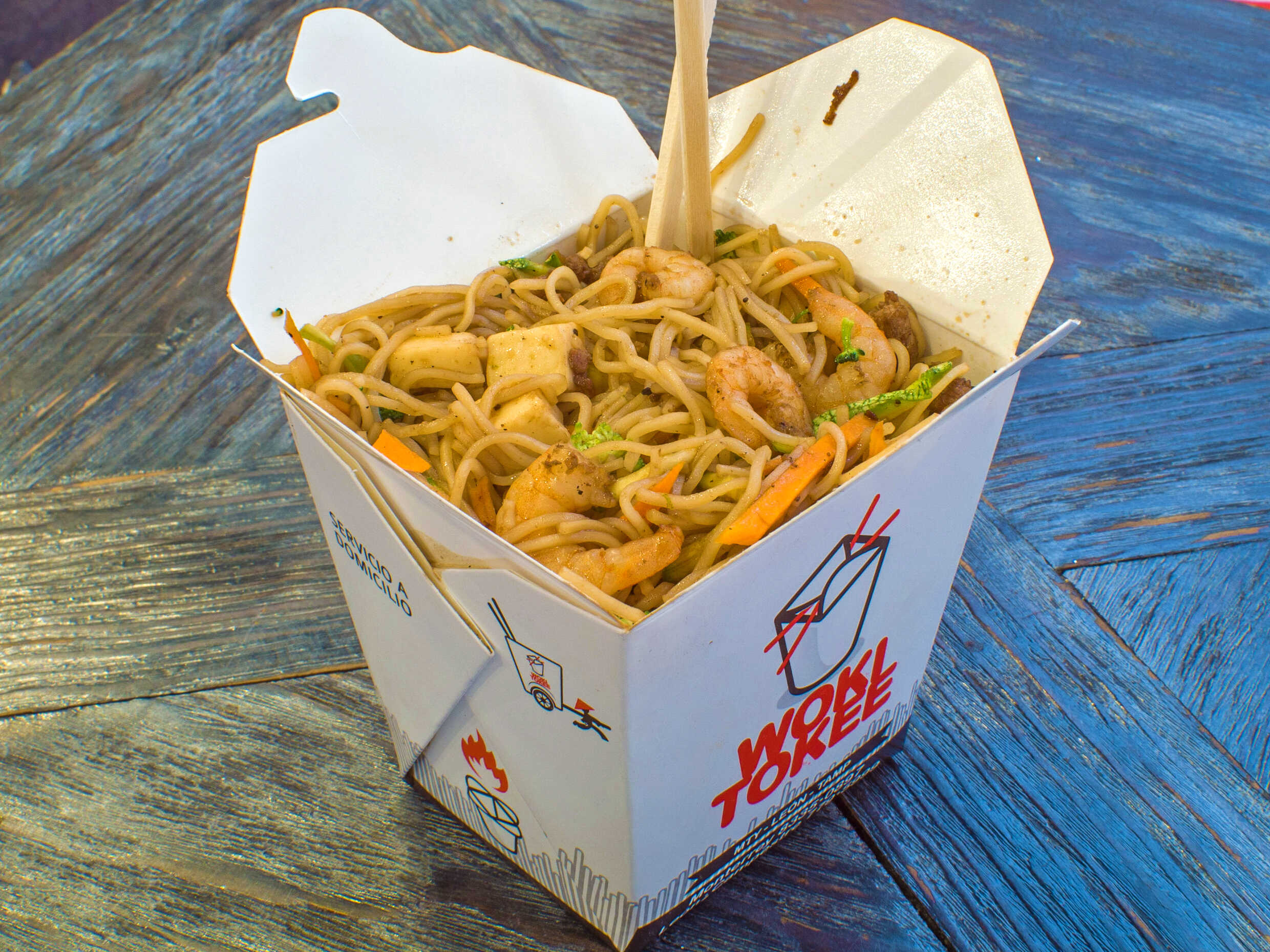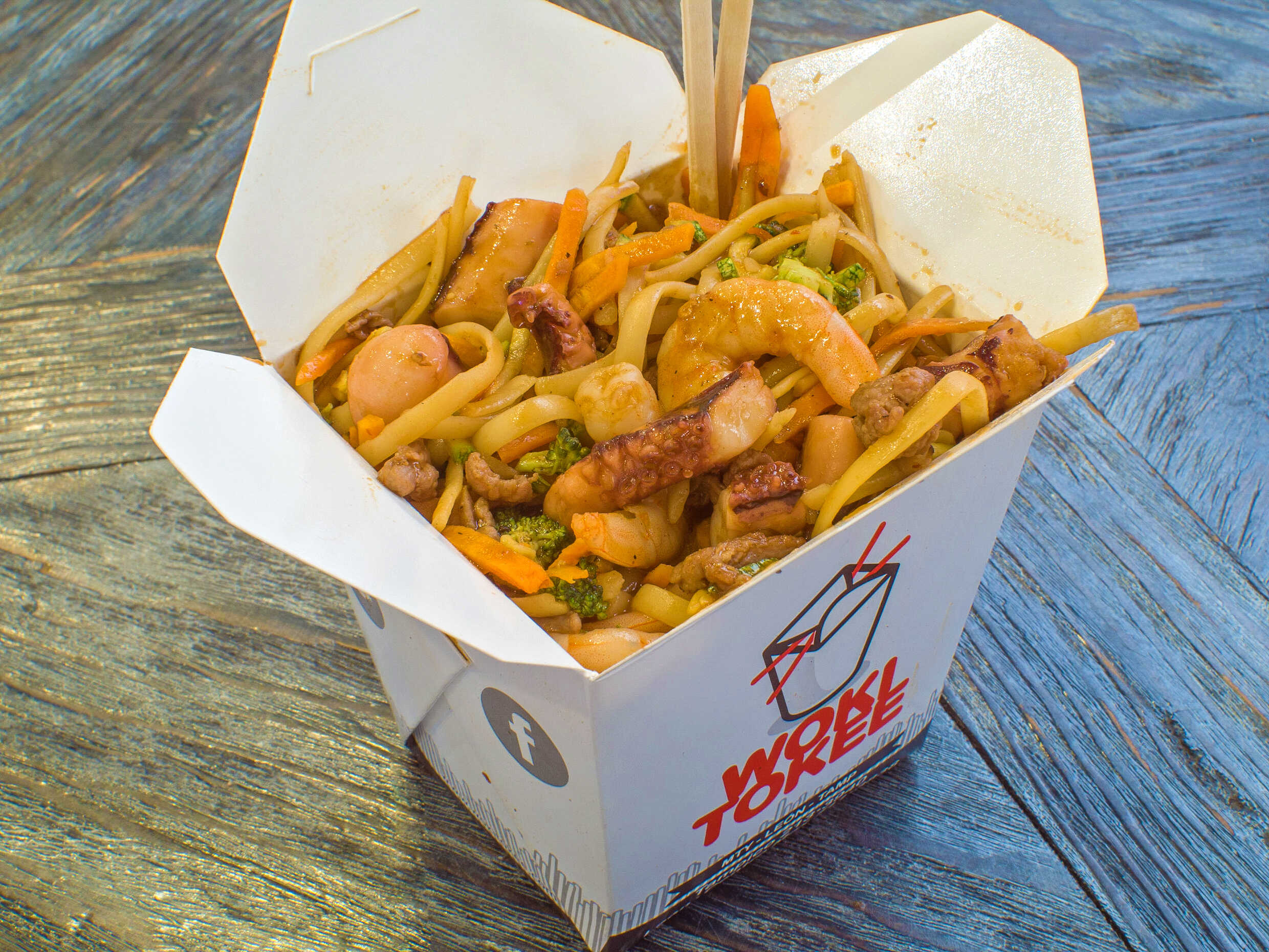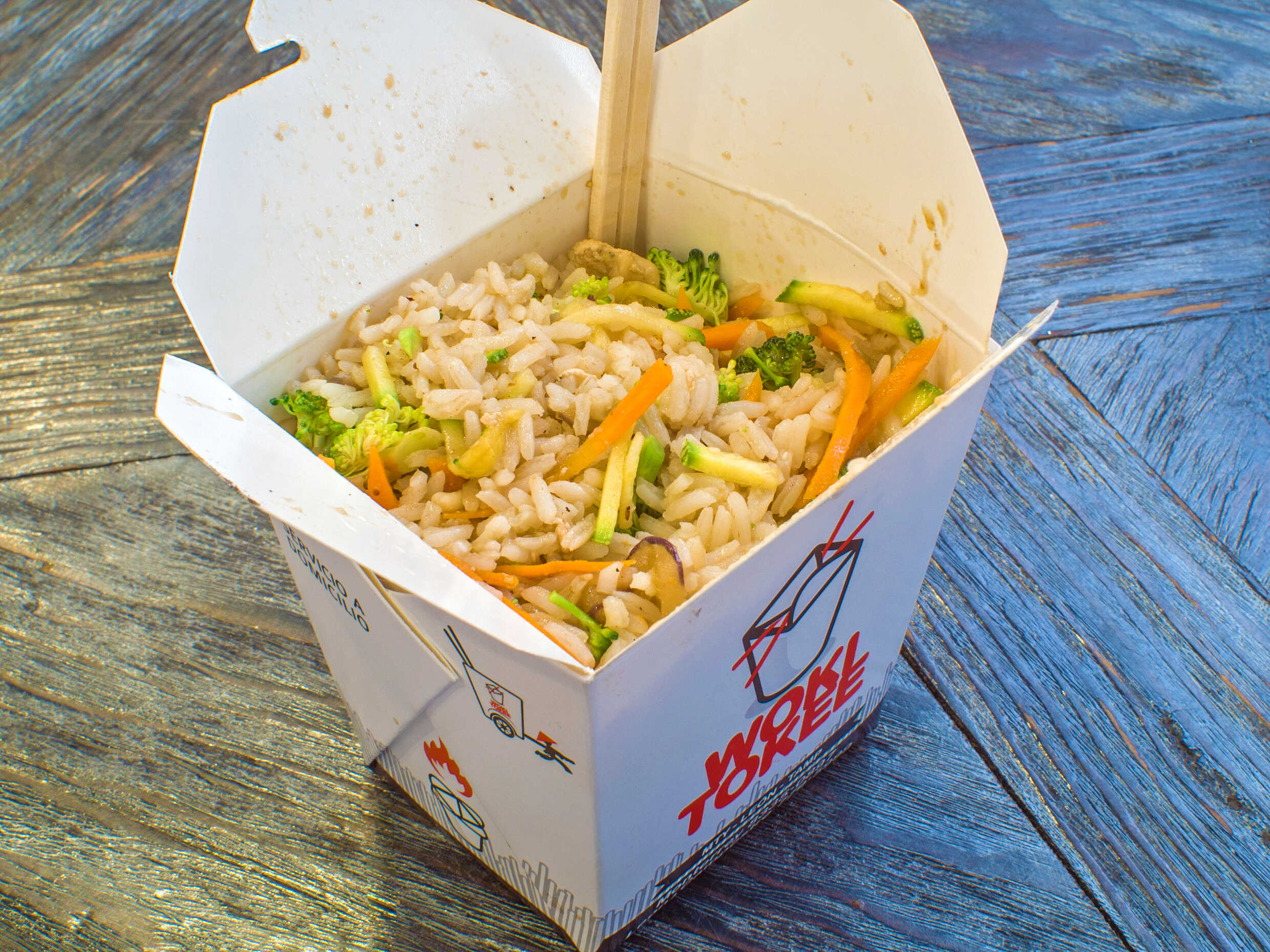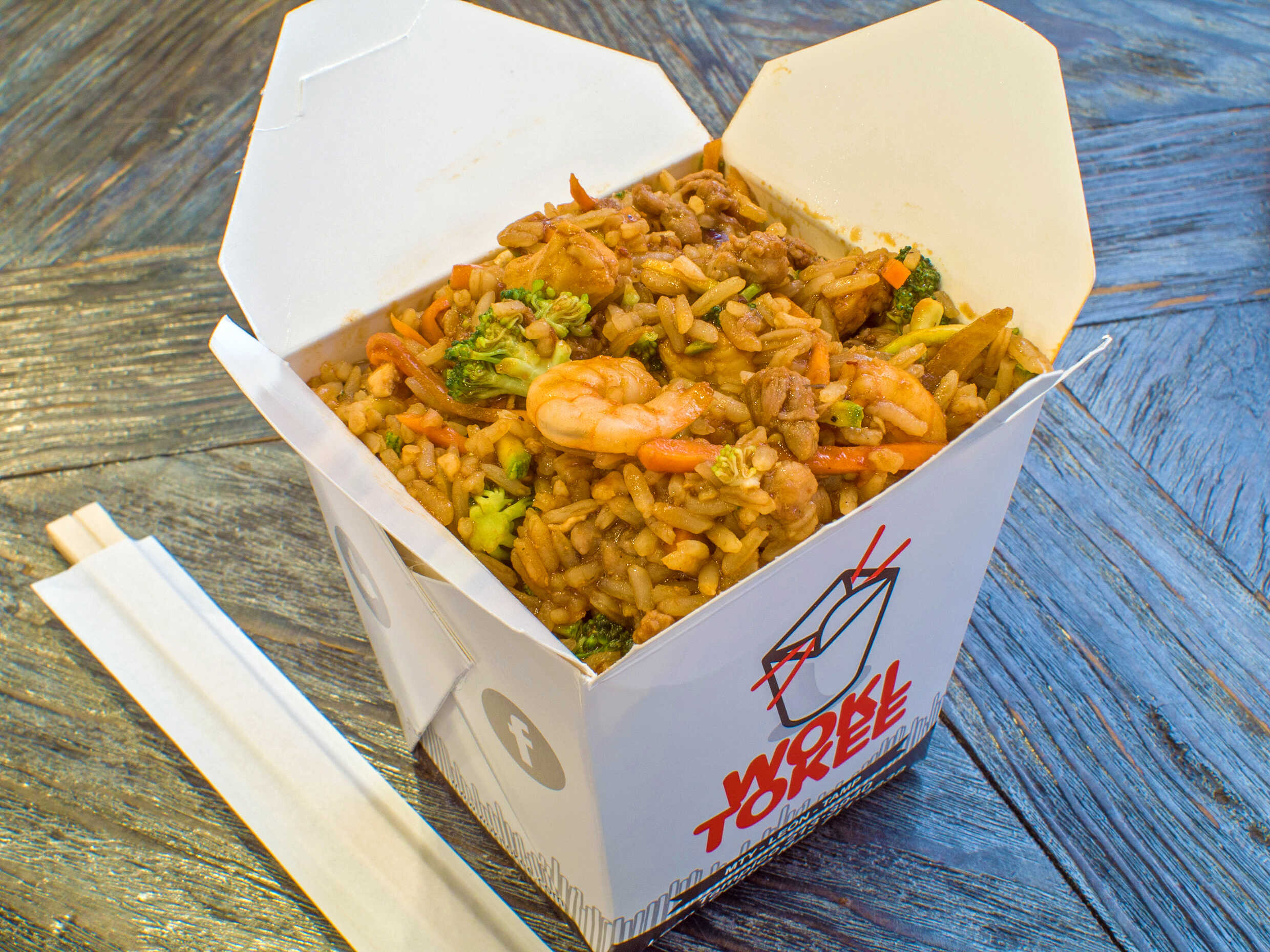 1 Woki Supreme arroz frito con 240gr de pollo, camarón, incluye brócoli, calabaza, arrechera + Bebida del día de un litro. Platillo personal
