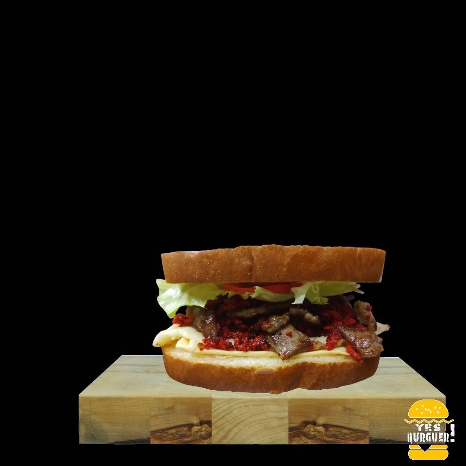 Carne de res, Arrachera, tocino, queso amarillo, queso asadero, lechuga, jitomate, cebolla, jalapeño y aderezos.