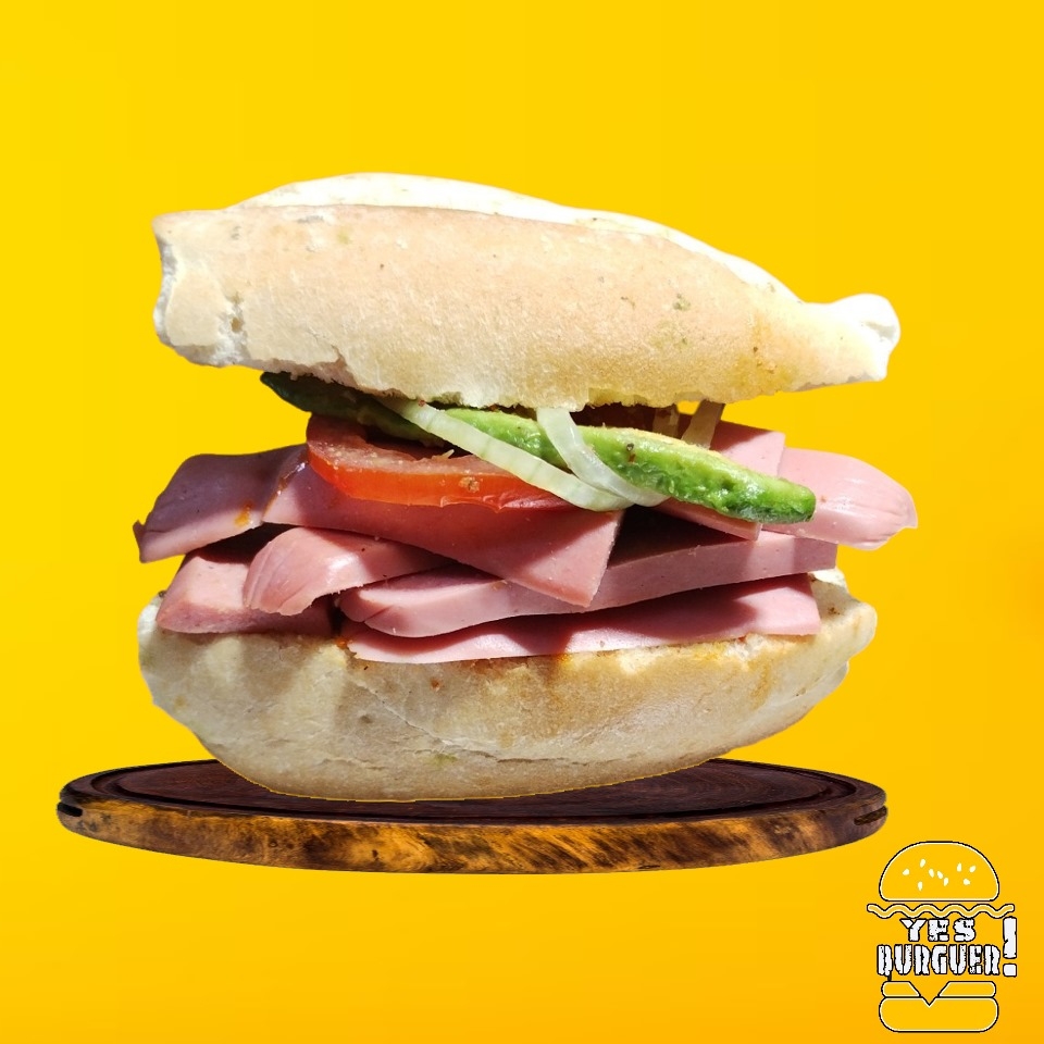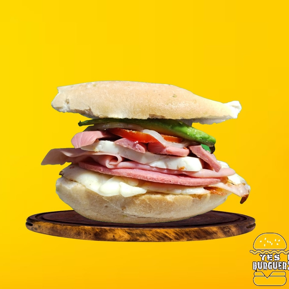 Jamón, queso amarillo, queso panela, lechuga, jitomate, cebolla, jalapeño y aderezos.