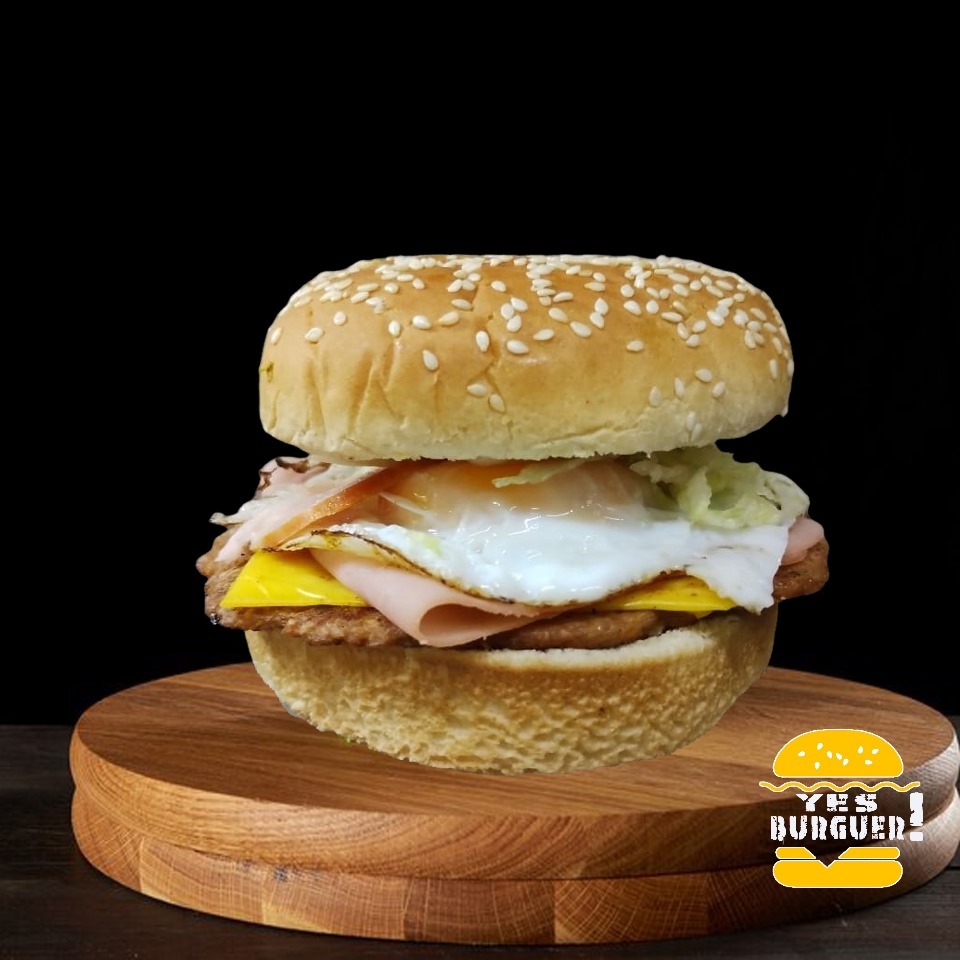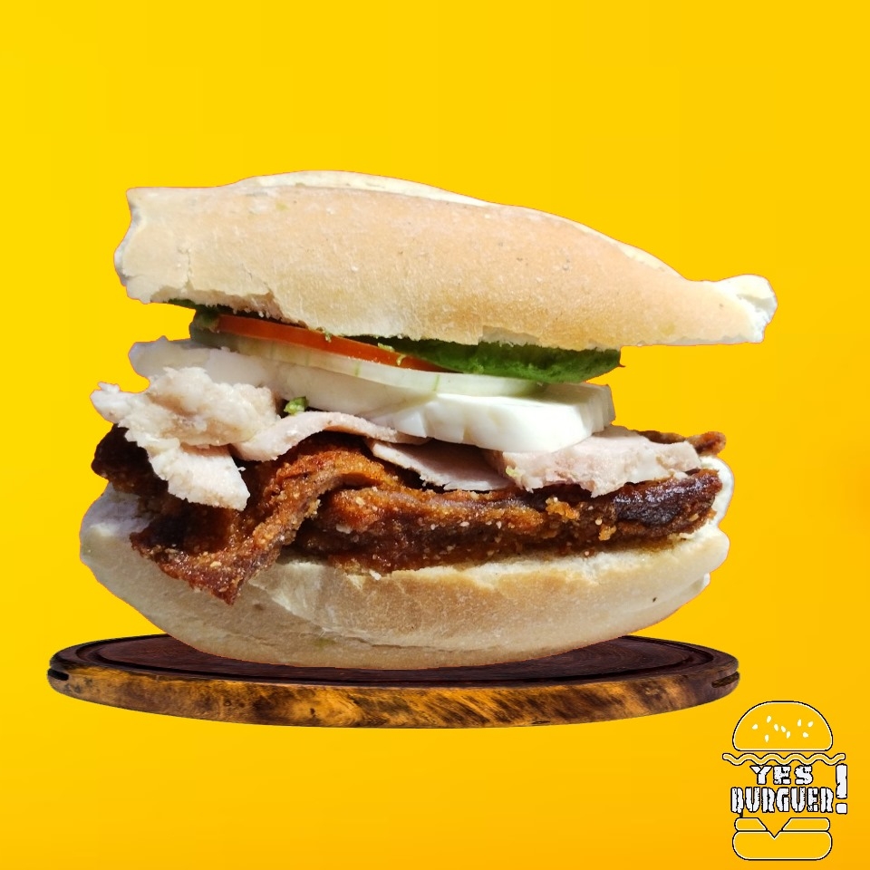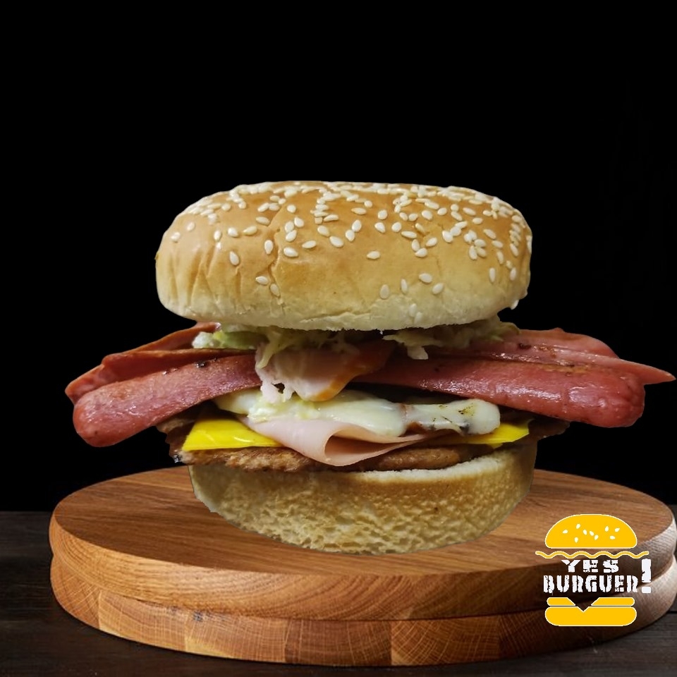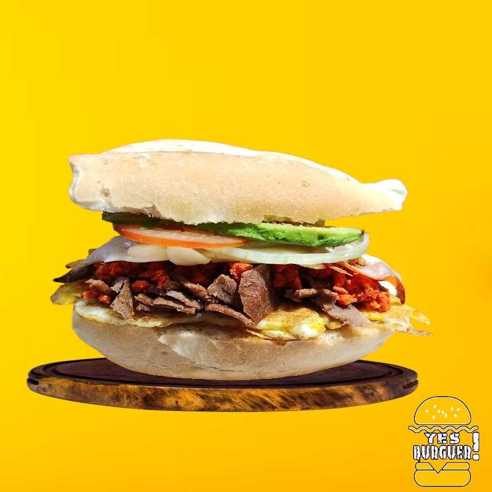 Carne de Res, jamón, tocino, queso amarillo, queso asadero, huevo estrellado, lechuga, jitomate, cebolla, jalapeño y aderezos.