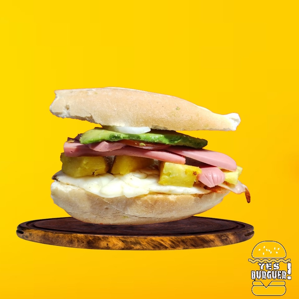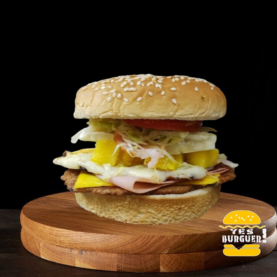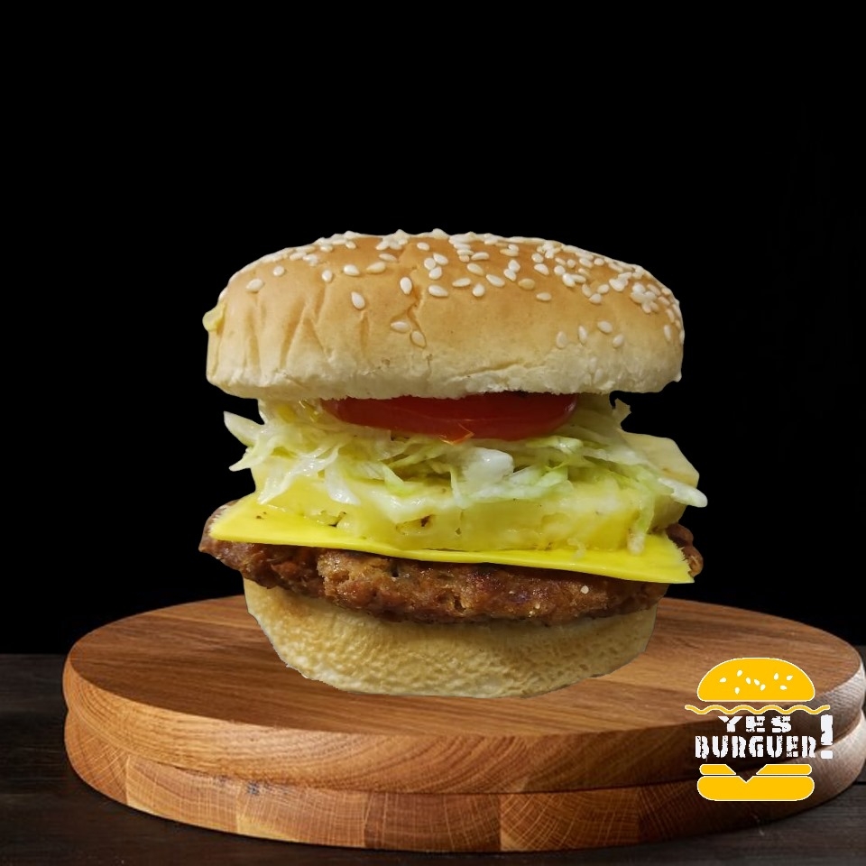 Hamburguesa de Res (200gr), Queso Amarillo, Rebanada de Piña, pepinillos, lechuga, jitomate, cebolla, jalapeño y aderezos.