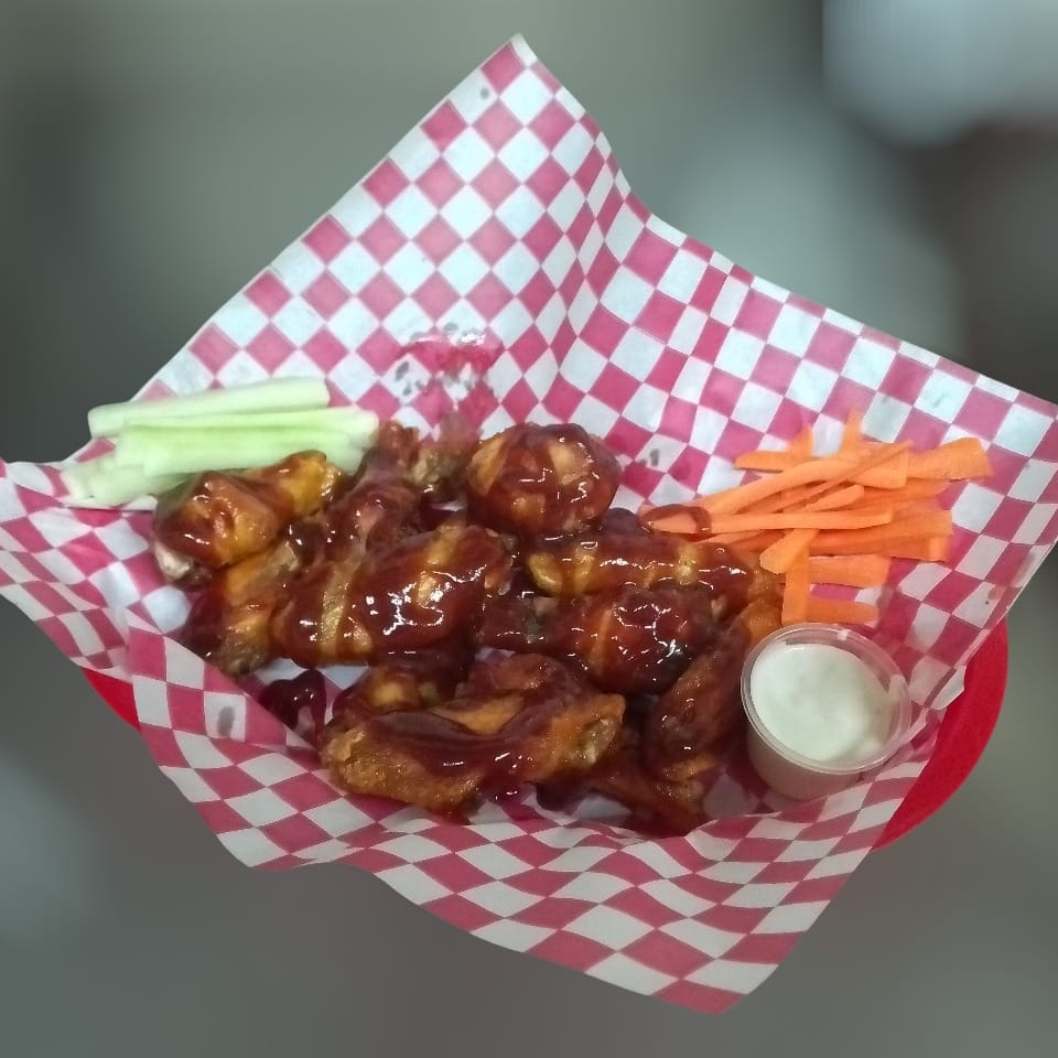 12 piezas de alitas bañadas en salsa de tu eleccion acompañadas de aderezo ranch, zanahoria y pepino.