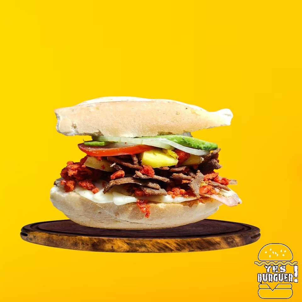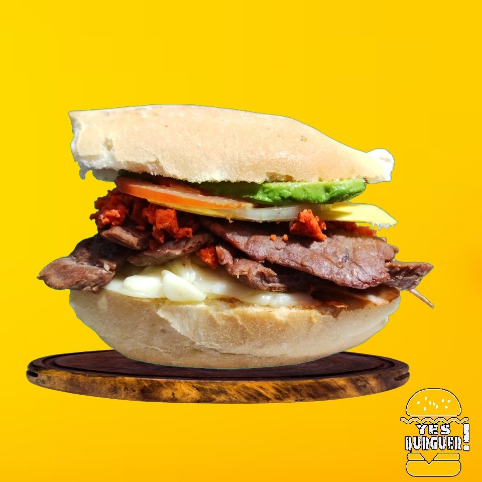 Carne de res, queso asadero, queso amarillo, tocino, lechuga, jitomate, cebolla, jalapeño y aderezos.