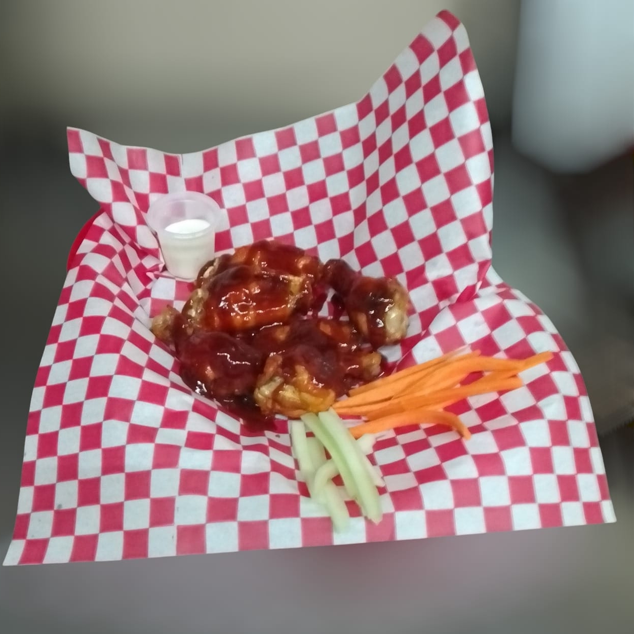 6 piezas de alitas bañadas en salsa de tu eleccion acompañadas de aderezo ranch, zanahoria y pepino.