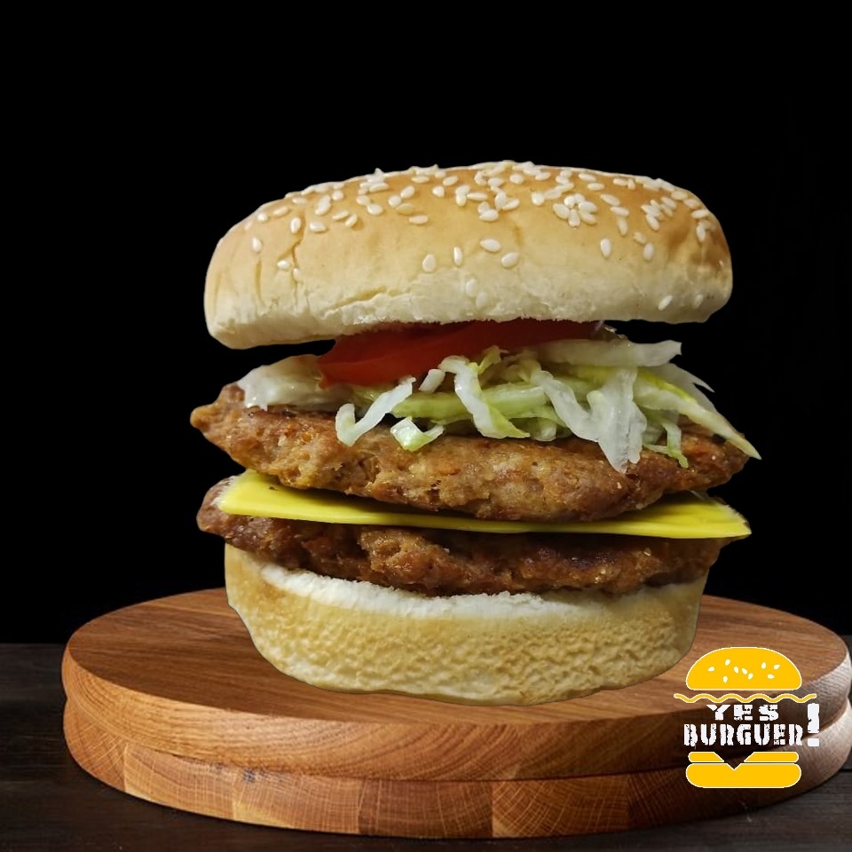 2 Carnes de res, Queso amarillo, Lechuga, jitomate, cebolla, jalapeño y aderezos.