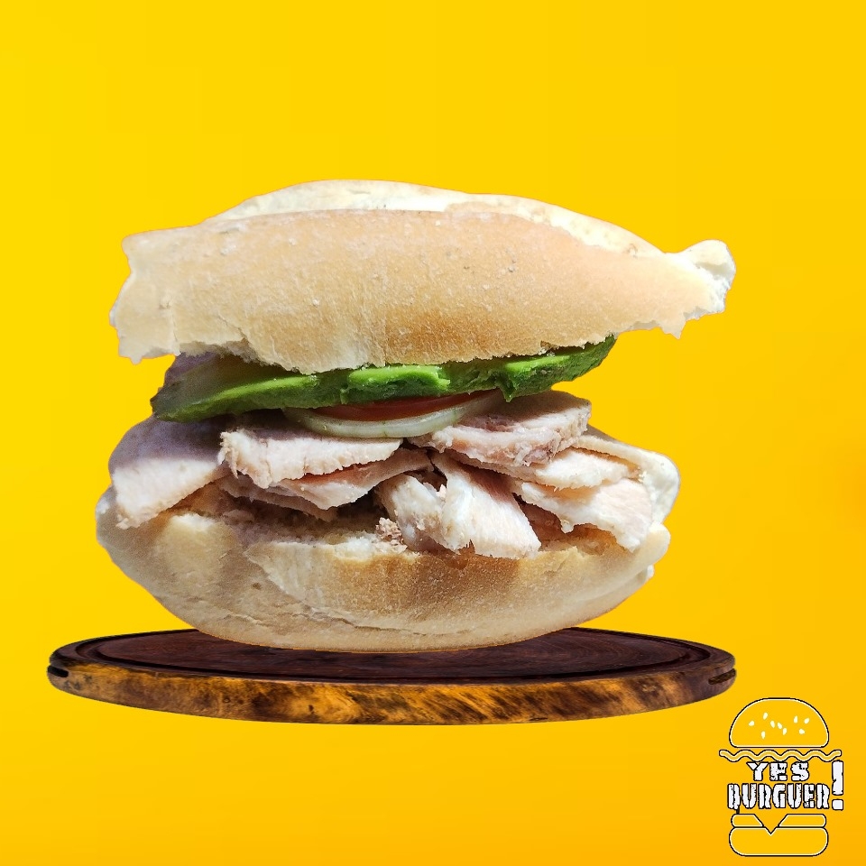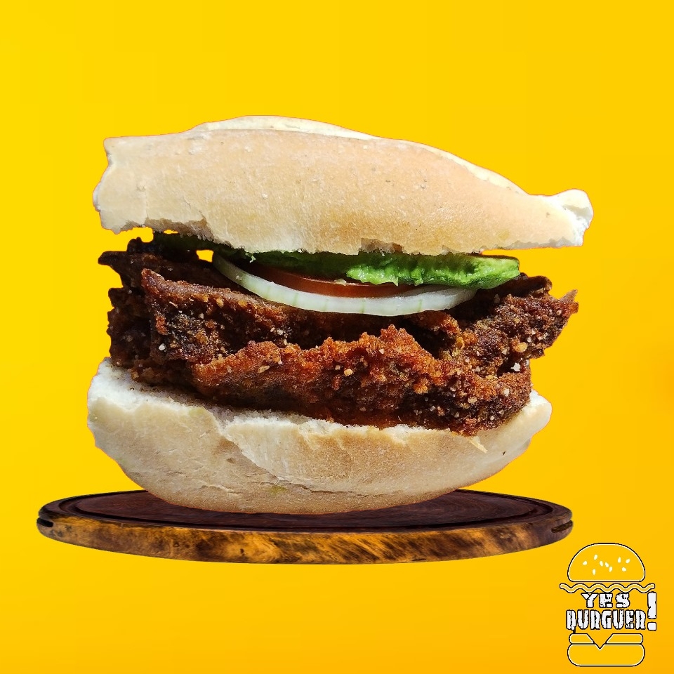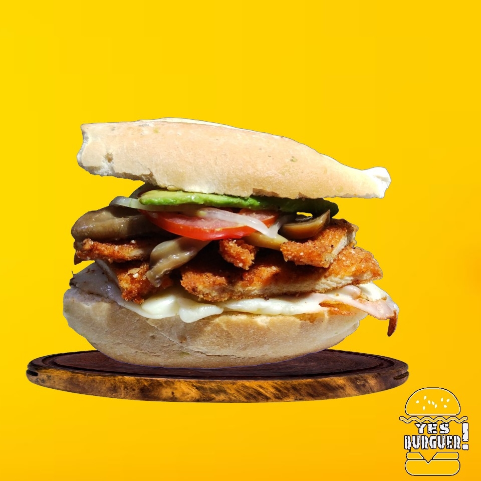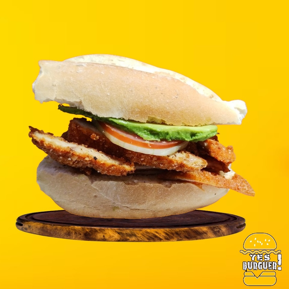 Milanesa de Pollo, aguacate, jitomate, cebolla, jalapeño y aderezos.