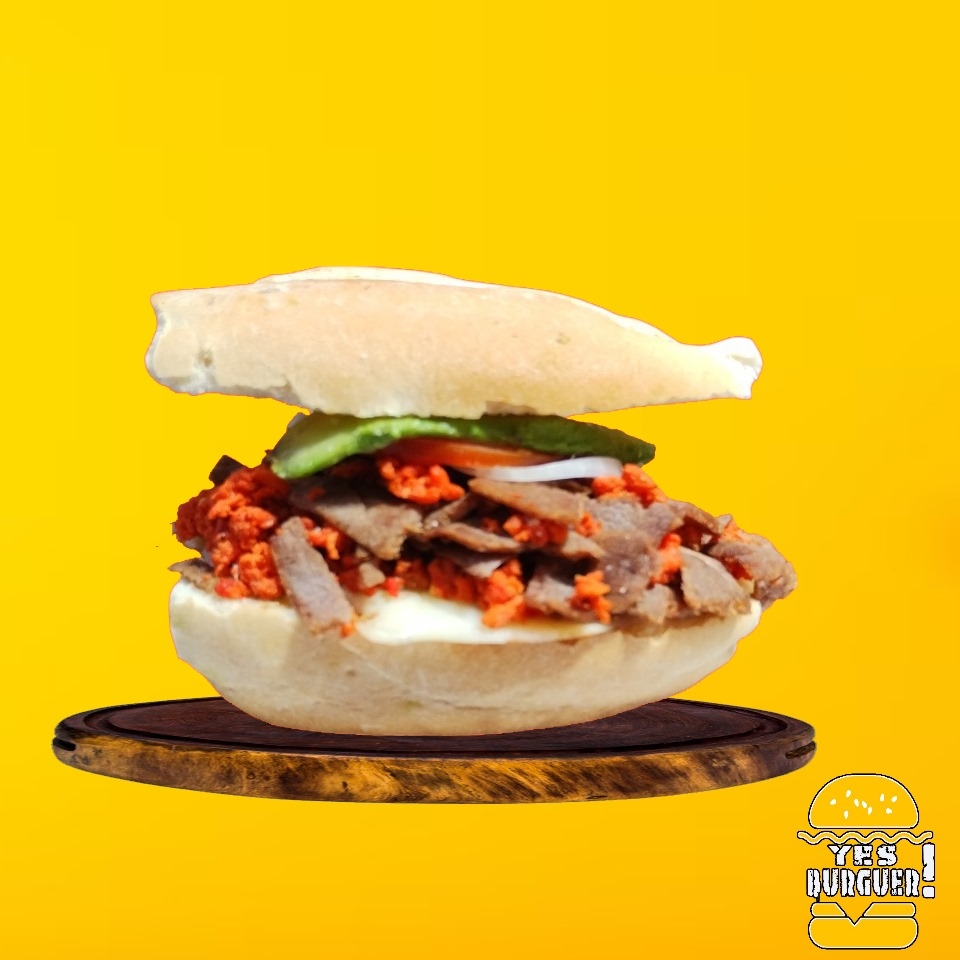 Carne de res (200gr), con carne al pastor, pepinillos, lechuga, jitomate, cebolla, jalapeño y aderezos.