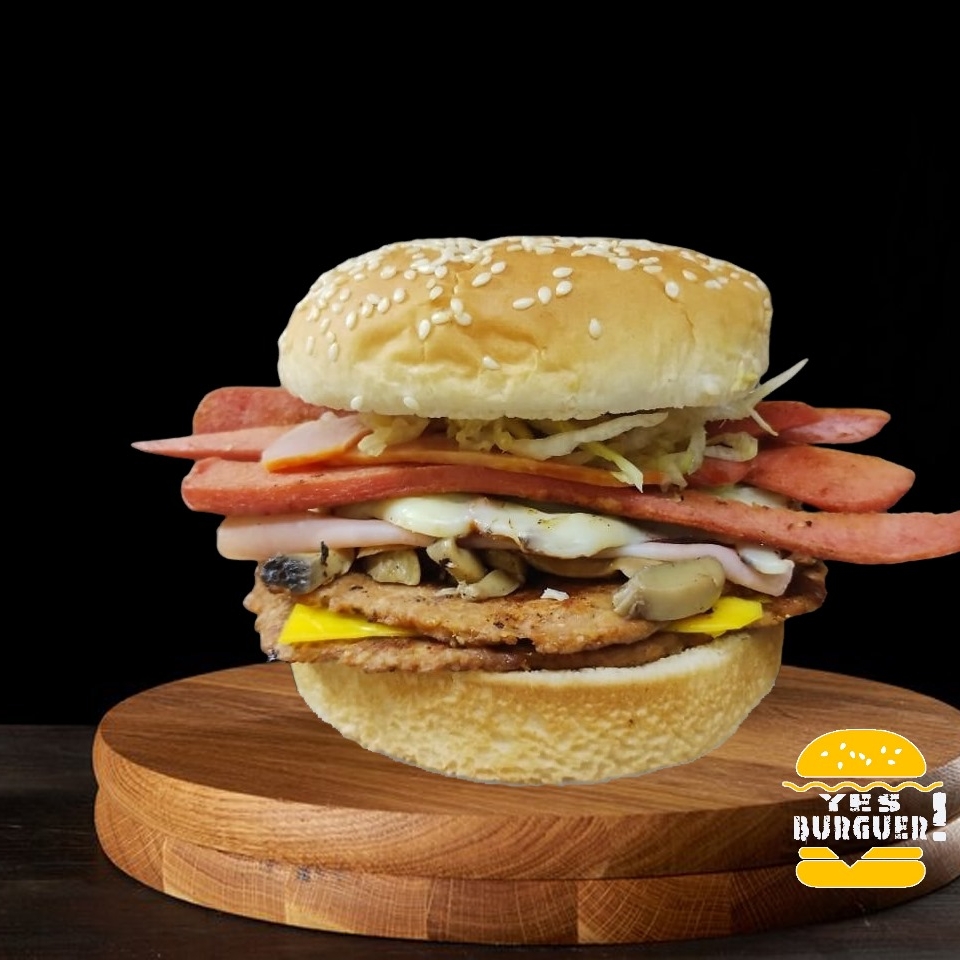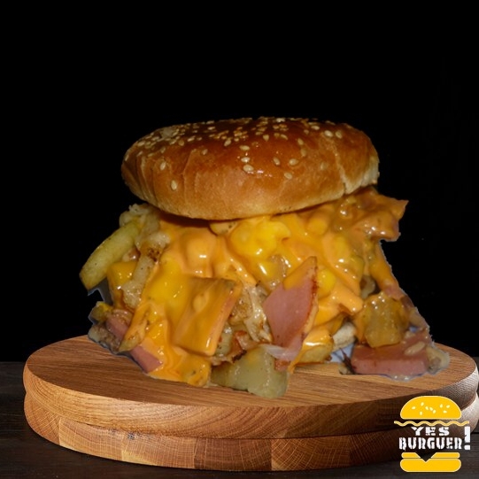 Carne de res (200gr) queso amarillo, queso asadero, tocino, champiñones, pepinillos, lechuga, jitomate, cebolla asada, jalapeño, aderezos, acompañada con porción de patatas.