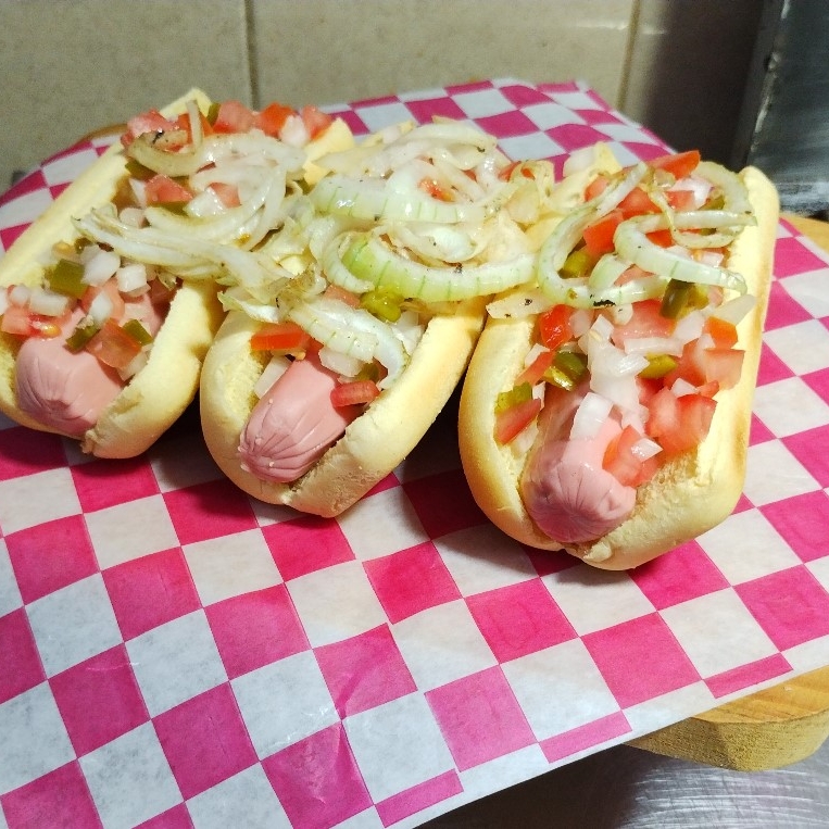 Salchicha, aguacate, jitomate, cebolla, jalapeño y aderezos.