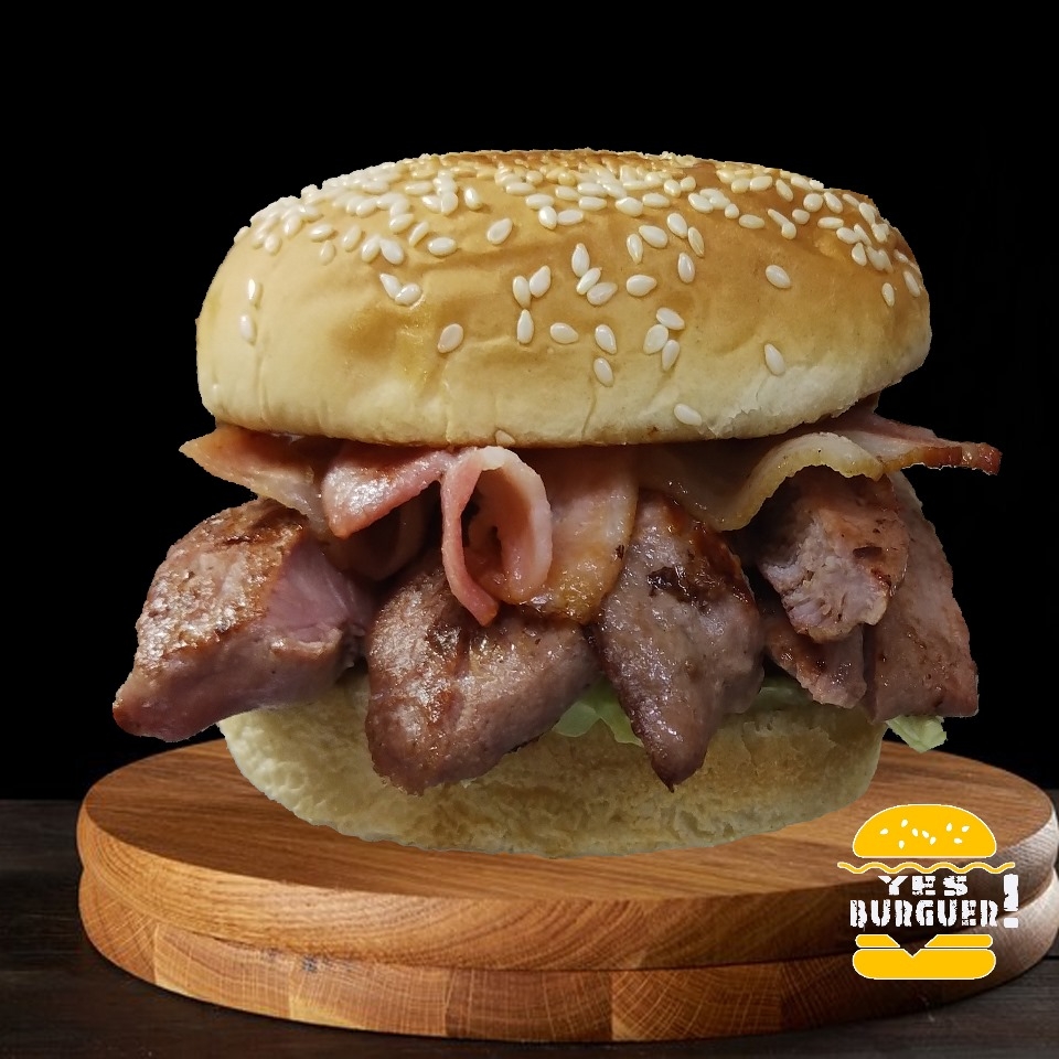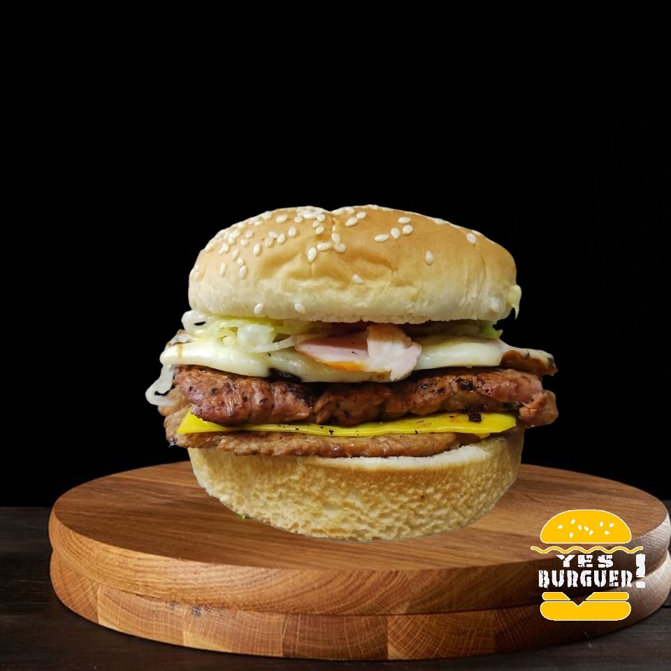 2 carnes de res con tocino (180gr c/u), 2 Quesos Amarillos, Queso asadero, pepinillos, Cebolla caramelizada, salsa BBQ, jitomate a la plancha, chile serrano toreado, lechuga y aderezos.