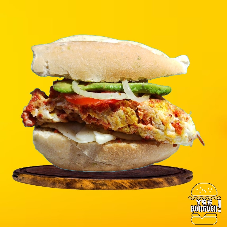 Chorizo con huevo, aguacate, queso asadero, jitomate, cebolla, jalapeño y aderezos.