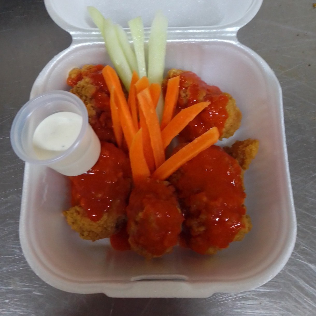 5 piezas de Boneless bañadas en aderezo de tu eleccion acompañada con aderezo ranch, zanahoria y pepino.