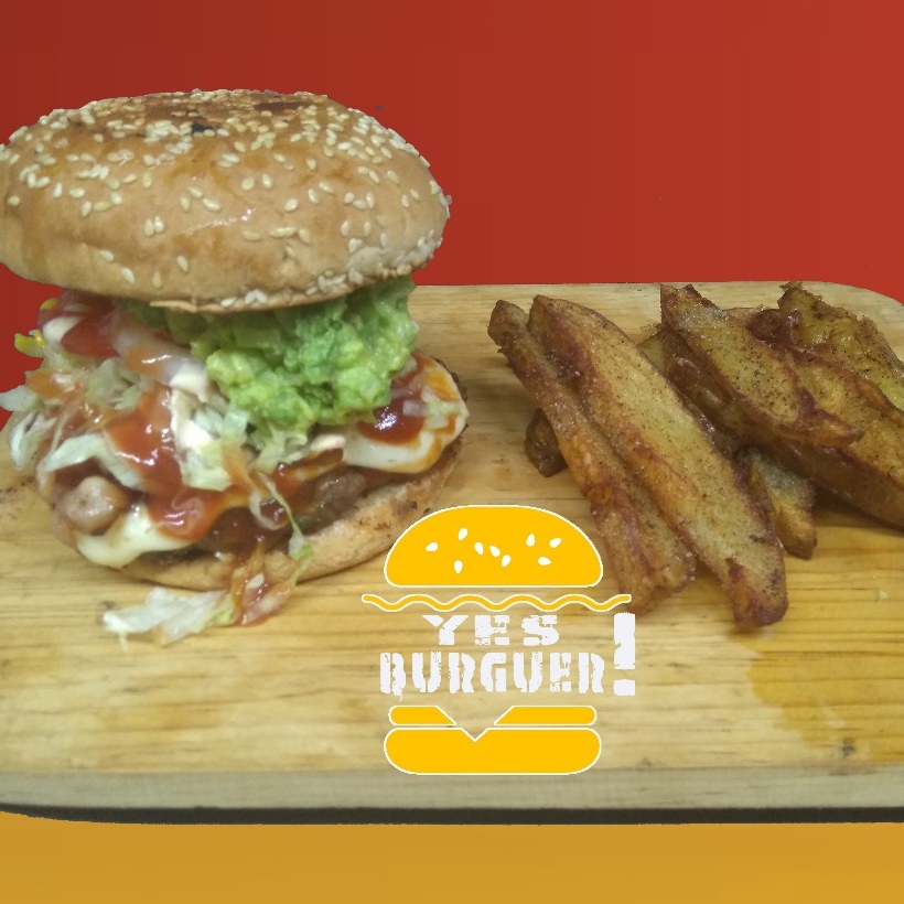 Carne de res (200gr), queso amarillo, queso asadero, tocino, guacamole, frijoles, pepinillos, lechuga, jitomate, cebolla asada, jalapeño y aderezos acompañado con porción de patatas.