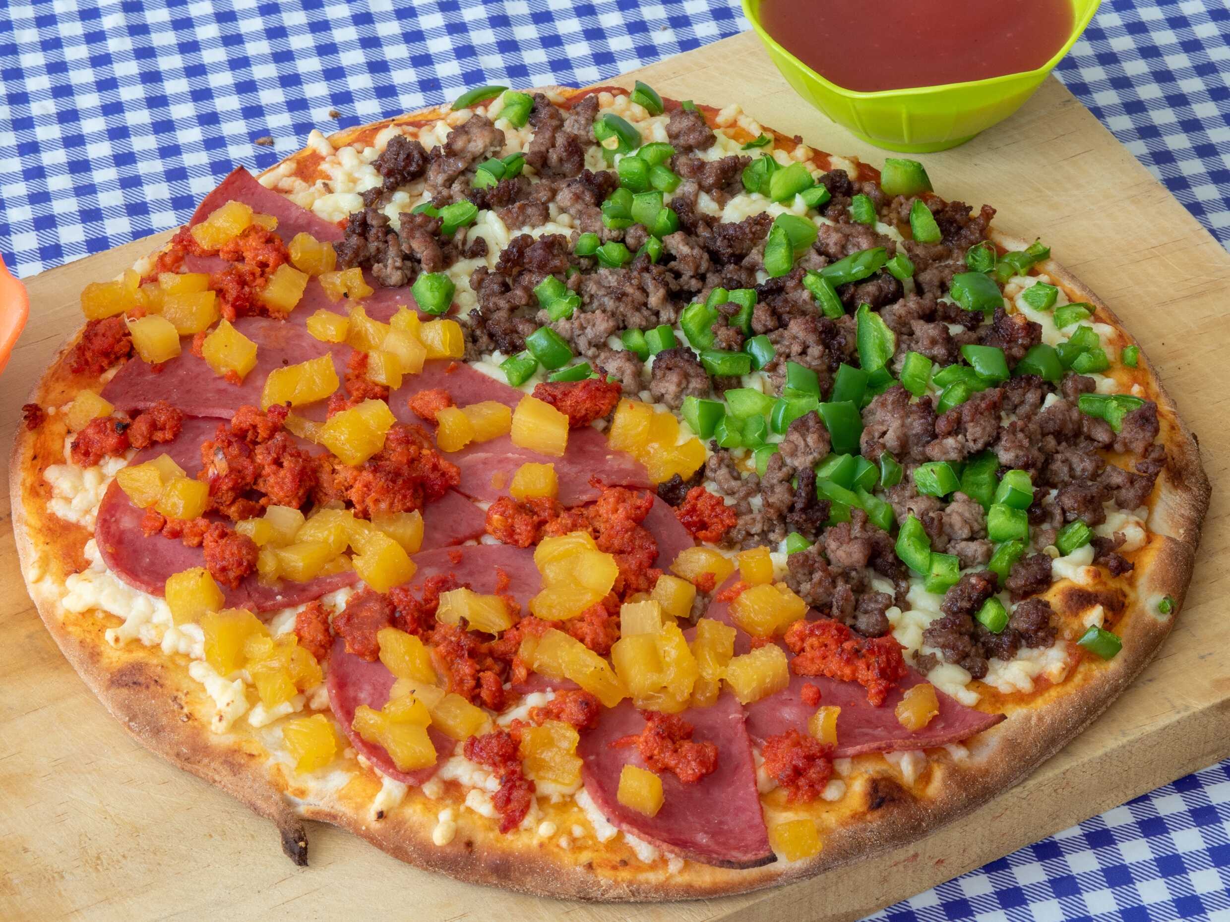Cuarta parte Peperoni/cuarta parte tocino/cuarta parte queso/cuarta parte jamón piña.