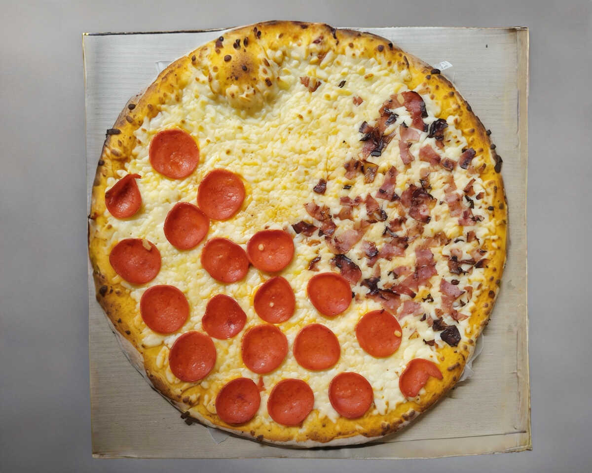 mitad peperoni cuarta parte tocino cuarta parte queso