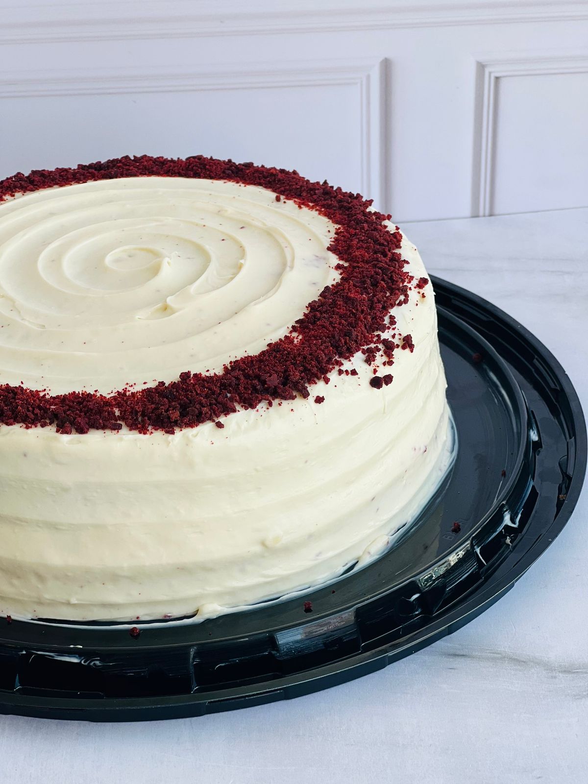 Pastel de color rojo y consistencia esponjosa, relleno de una capa de cheesecake y cubierto con betún de queso crema (12 - 15 porciones)