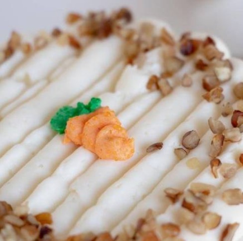 Pan de zanahoria relleno de una capa de cheesecake, embetunado con betun de queso crema, decorado con nuez . (Rinde para 12 - 15 personas aprox)