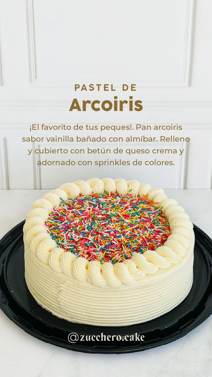 ¡El favorito de tus peques!. Pan arcoiris sabor vainilla; bañado con almíbar. Relleno y cubierto con betún de queso crema y adornado con sprinkles de colores. (Rinde de 12-15 personas aprox)