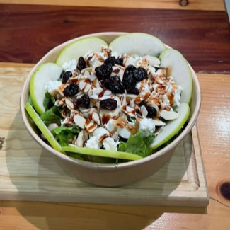 Lechuga, manzana, arándanos, almendras, nueces y reducción de vinagre balsámico, queso de cabra.