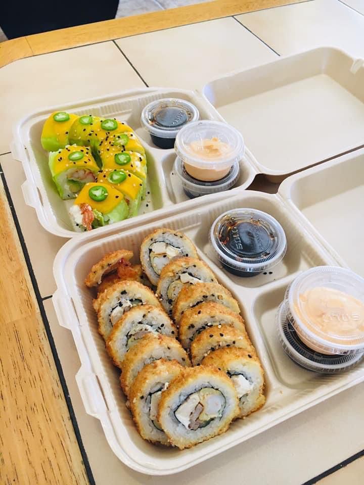10 piezas de sushi con aguacate, pepino, cangrejo, cubierto de queso crema por encima.