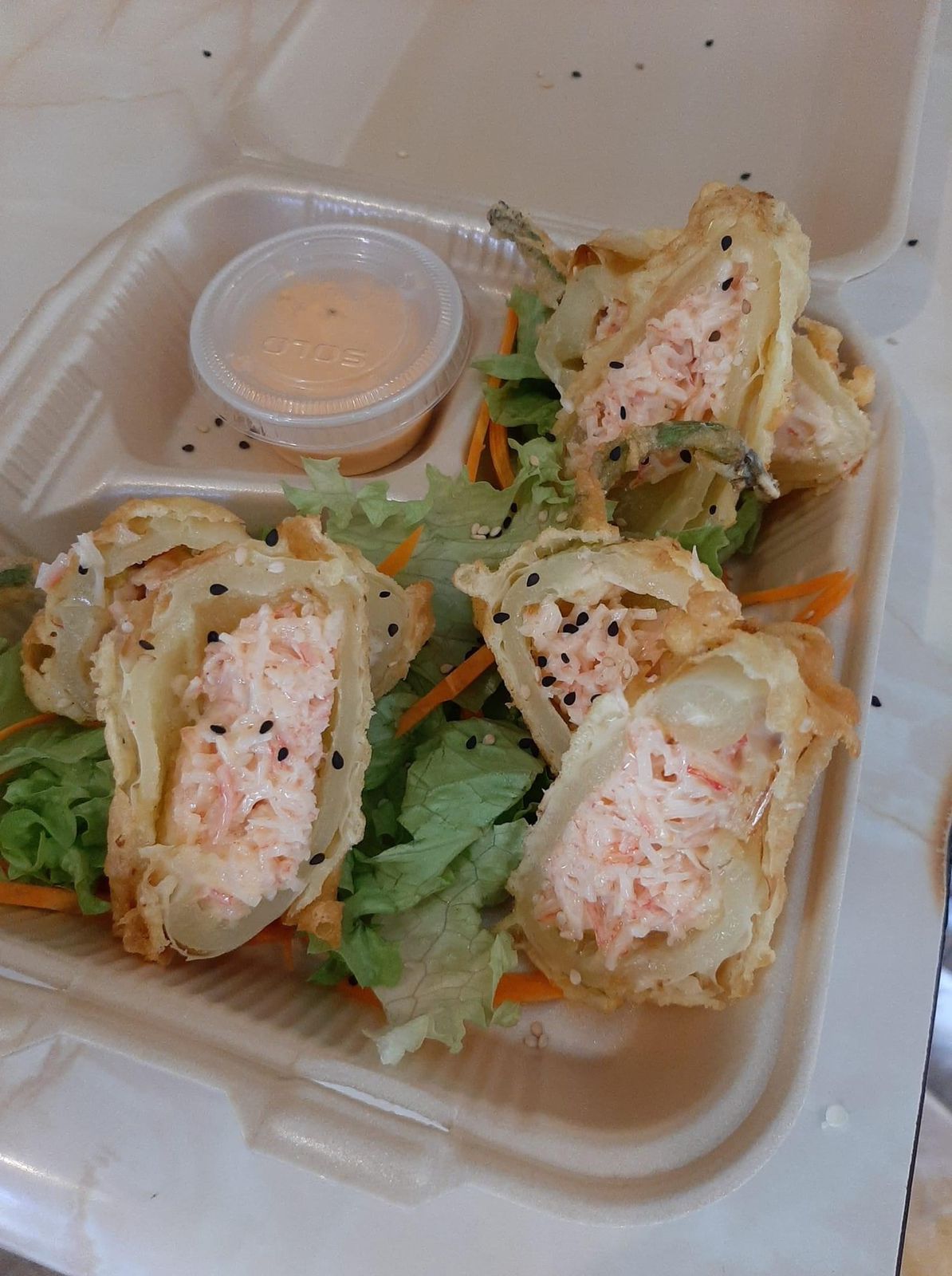 chiles rellenos de cangrejo picoso, capeados en témpura, servido en aderezo de ajonjolí.