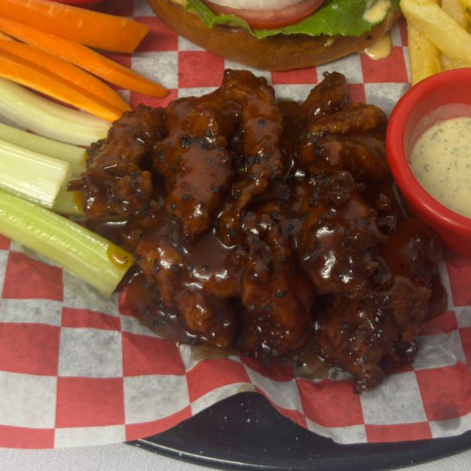 Alitas bañadas en salsa acompañada con aderezo y verduras.
