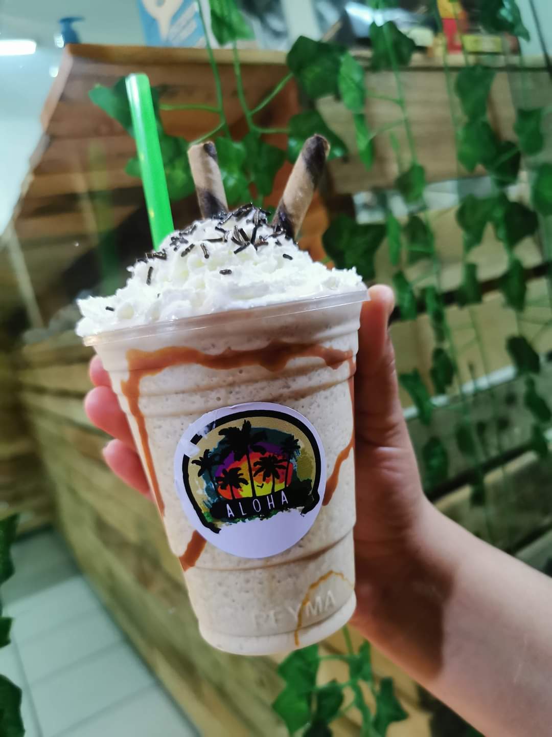 Delicioso frappe de Moka, decorado con chocolate hershey, crema batida, galleta rellena de avellana y chispas de chocolate.