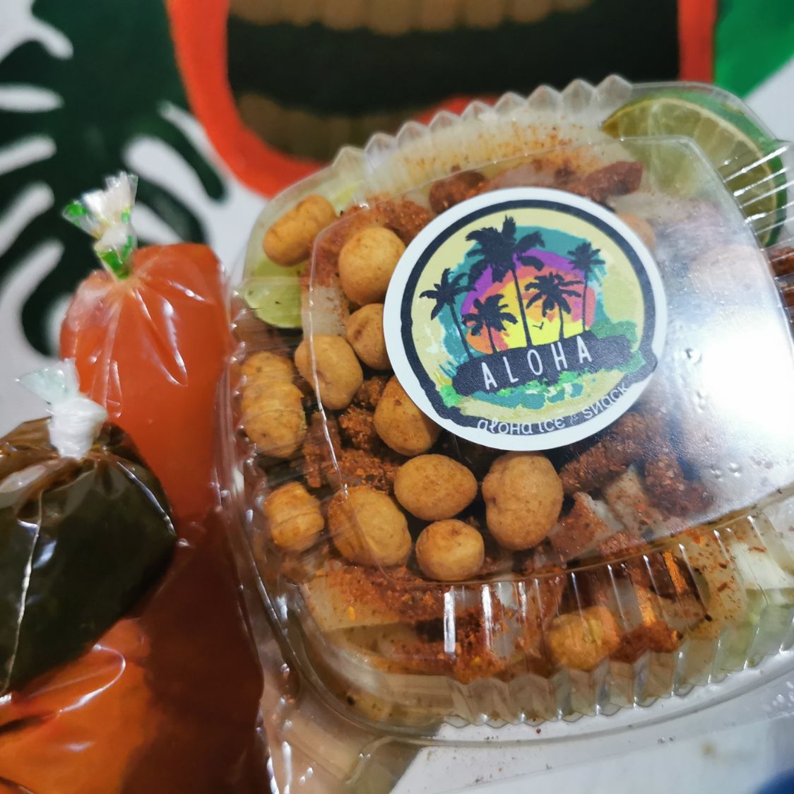 Jicama, pepino, cacahuates, relitos, cueritos, clamato, porcion de chips naturales