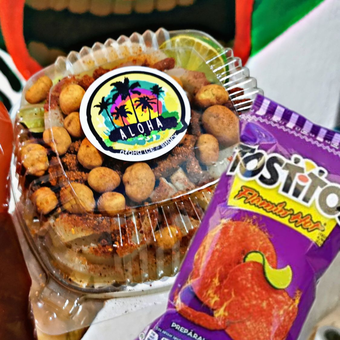 Jicama, pepino, cacahuates, relitos, cueritos, clamato, porcion de chips naturales