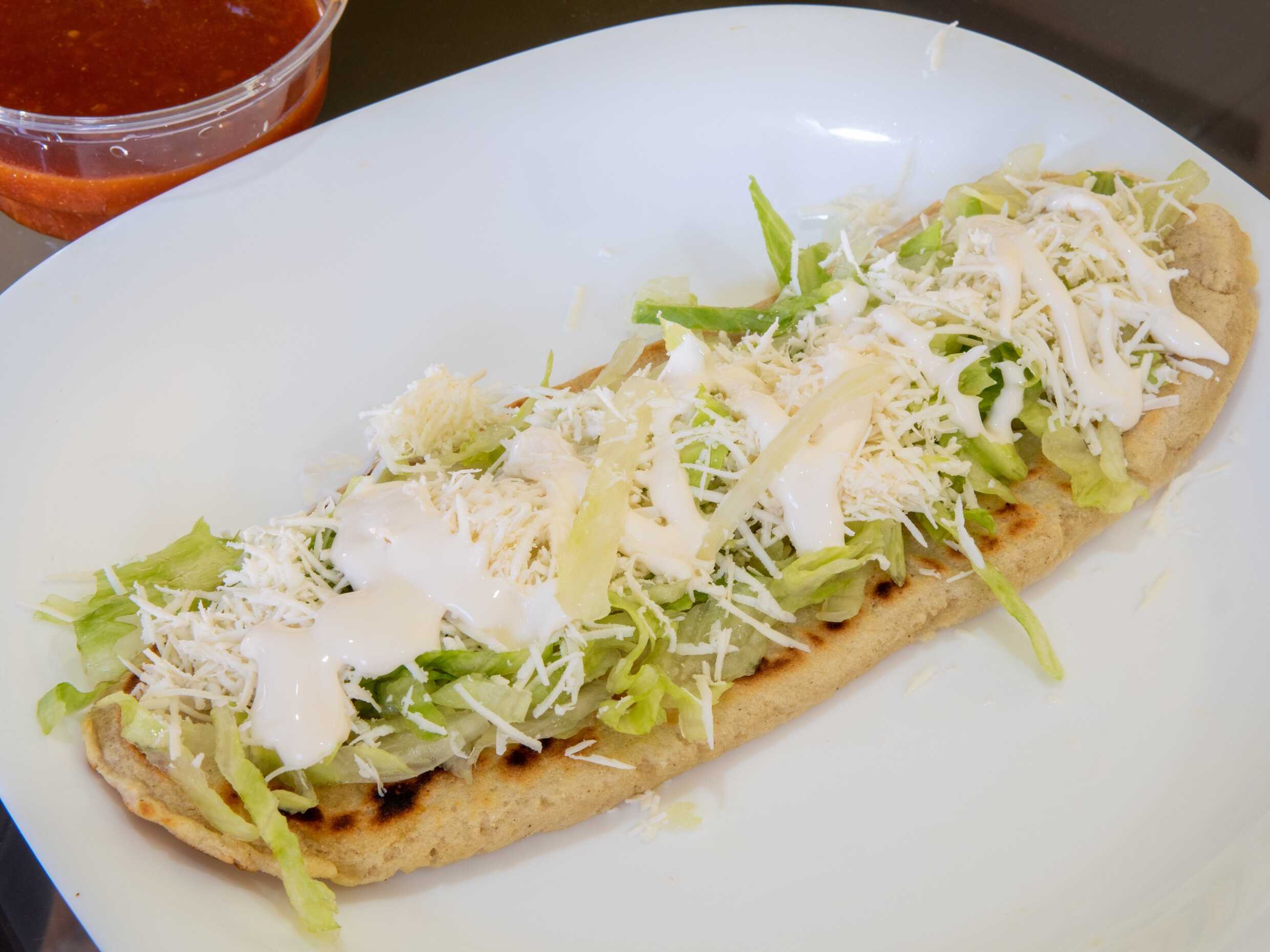 Huarache de maíz con una base de frijoles, queso asadero gratinado en una cama de lechuga queso cotija y crema con el rey del platillo carne asada. Salsa aparte
