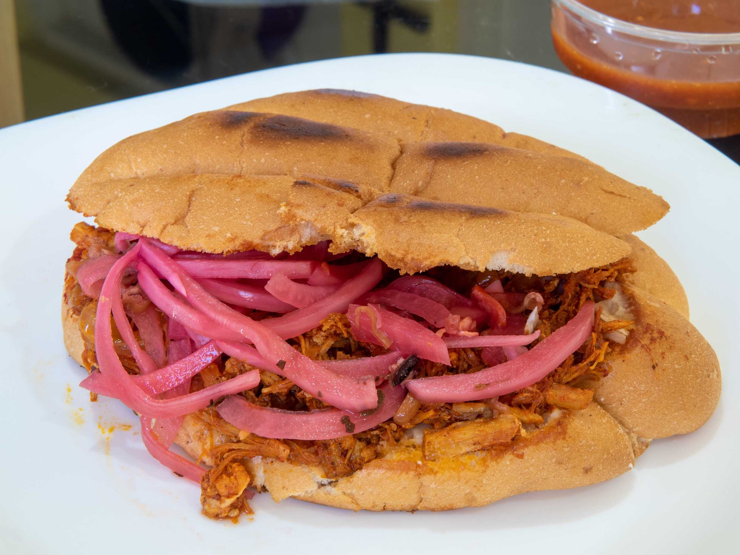 Tortilla hecha a mano rellena de frijol y arriba cochinita pibill y cebollita curtida con habanero.